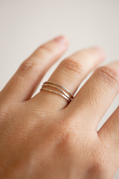 Each ring is shaped, hammered and polished by hand, giving it a subtle organic texture that catches the light in the most beautiful way. Wear it solo for a clean, minimal moment or stack it with your favorites to create a set that tells your story.